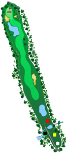 Wer sicher gehen will, platziert seinen Abschlag mit einem Fairwayholz auf dem Fairway und zielt danach mit einem mittleren Eisen auf die Landeszone vor dem Wasser.